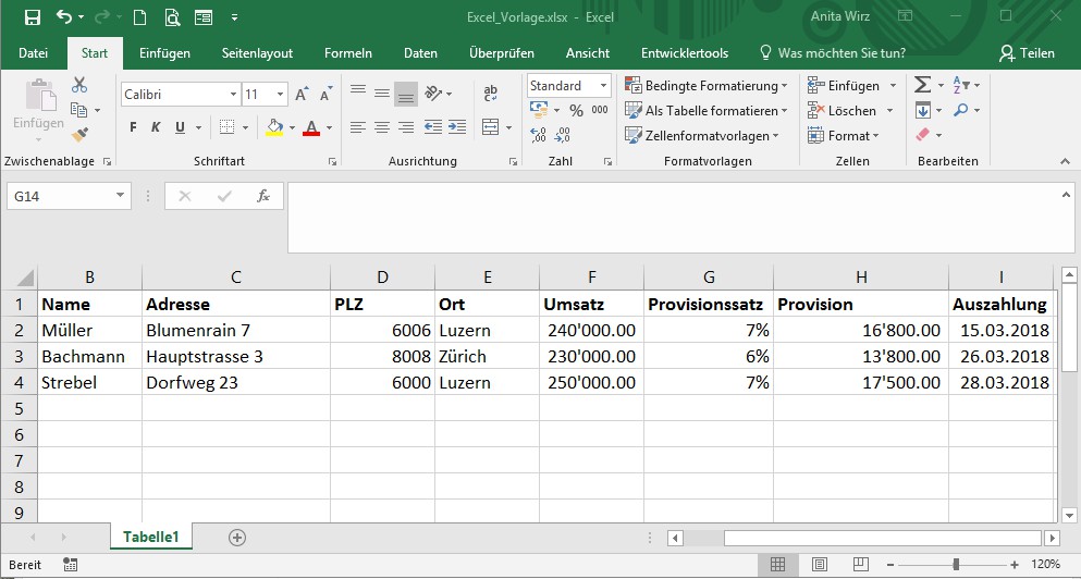 Der Serienbrief sieht dann bei der Verwendung von Quick Merge automatisch entsprechend der Excel-Tabelle folgendermassen aus (Beispiel in Schweizer Formatierung):